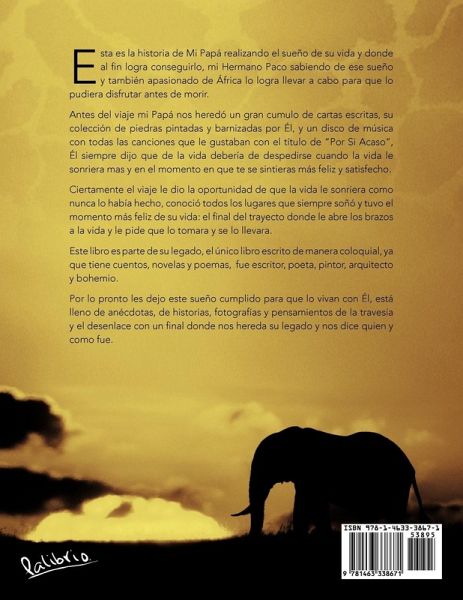 Esta es la historia de Mi Papá realizando el sueño de su vida y donde al fi n logra conseguirlo, mi Hermano Paco sabiendo de ese sueño y también apasionado de África lo logra llevar a cabo para que lo pudiera disfrutar antes de morir. Antes del viaje mi Papá nos heredó un gran cumulo de cartas escritas, su colección de piedras pintadas y barnizadas por Él, y un disco de música con todas las canciones que le gustaban con el título de "Por Si Acaso", Él siempre dijo que de la vida debería de despedirse cuando la vida le sonriera mas y en el momento en que te se sintieras más feliz y satisfecho. Ciertamente el viaje le dio la oportunidad de que la vida le sonriera como nunca lo había hecho, conoció todos los lugares que siempre soñó y tuvo el momento más feliz de su vida: el final del trayecto donde le abre los brazos a la vida y le pide que lo tomara y se lo llevara. Este libro es parte de su legado, el único libro escrito de manera coloquial, ya que tiene cuentos, novelas y poemas, fue escritor, poeta, pintor, arquitecto y bohemio. Por lo pronto les dejo este sueño cumplido para que lo vivan con Él, está lleno de anécdotas, de historias, fotografías y pensamientos de la travesía y el desenlace con un final donde nos hereda su legado y nos dice quien y como fue.