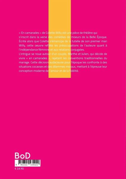 « En camarades » de Colette Willy est une pièce de théâtre qui s'inscrit dans la veine des comédies de moeurs de la Belle Époque. Écrite alors que Colette s'émancipe de la tutelle de son premier mari Willy, cette oeuvre reflète les préoccupations de l'auteure quant à l'indépendance féminine et aux relations conjugales. L'intrigue se noue autour d'un couple, Marthe et Julien, qui décide de vivre « en camarades », rejetant les conventions traditionnelles du mariage. Cette décision audacieuse pour l'époque les confronte à des situations cocasses et des dilemmes moraux, mettant à l'épreuve leur conception moderne de l'amour et de la fidélité. Colette dépeint avec finesse les subtilités des rapports hommes-femmes, oscillant entre désir d'émancipation et persistance des schémas traditionnels. Son écriture, à la fois incisive et sensuelle, capture l'essence des bouleversements sociaux de son temps, faisant de cette pièce un témoignage précieux sur l'évolution des moeurs au début du XXe siècle. « En camarades » s'inscrit parfaitement dans la catégorie « Théâtre classique », tout en flirtant avec les genres « Littérature française » et « Études sur le féminisme ». L'oeuvre offre un regard pénétrant sur les aspirations à l'égalité dans le couple, thème qui résonne encore aujourd'hui avec force. Au-delà de sa valeur historique, la pièce reste d'une étonnante modernité dans son traitement des relations amoureuses et de l'indépendance artistique. Colette y démontre déjà la maîtrise stylistique et la profondeur psychologique qui feront sa renommée dans le monde littéraire français.