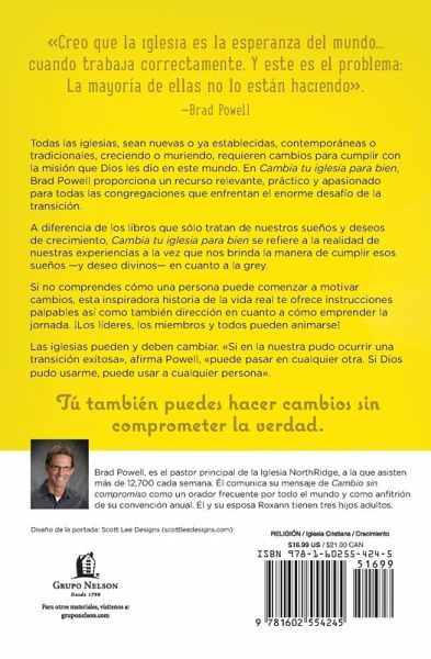 Cada semana m¿¿s y m¿¿s personas se alejan de la iglesia, no porque no crean sino porque la iglesia se ha vuelto irrelevante para sus vidas. No Dios, la iglesia. En 1990, Brad Powell se uni¿¿ a la Iglesia NorthRidge como pastor principal, una congregaci¿¿n sin entusiasmo luchando por ser relevante para Cristo. Ahora considerada una de "las iglesias de m¿¿s r¿¿pido crecimiento" en los estados del medio oeste y "una de las 50 iglesias m¿¿s influyentes". El pastor Powell restaur¿¿ la iglesia en una comunidad pr¿¿spera infundi¿¿ndola de amor, de alcance, relevancia cultural y una relaci¿¿n renovada con Dios. Cambia tu iglesia para bien suministra a los pastores y otros l¿¿deres de la iglesia, mediante experiencias personales directas y an¿¿cdotas, los recursos esenciales para que la alegr¿¿a y la vida sean restauradas en una iglesia que est¿¿ muri¿¿ndose. Si eres un l¿¿der buscando direcci¿¿n para el cambio, o un miembro orando para un milagro, este ejemplo viviente puede servirte de punto de partida para tu iglesia.