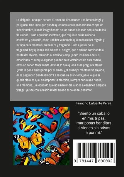 La delgada línea que separa el amor del desamor es una brecha frágil y peligrosa. Una línea que puede quebrarse con la más mínima chispa de incertidumbre, la más insignificante de las dudas o la más pequeña de las traiciones. Es un equilibrio inestable, que requiere de un cuidado constante y delicado, como una flor vulnerable que necesita ser regada y nutrida para mantener su belleza y fragancia. Pero a pesar de su fragilidad, hay quienes son adictos al peligro, que disfrutan caminando al borde del abismo, tentando al destino y empujando los límites de sus emociones. Y aunque algunos puedan salir victoriosos de esta osadía, otros no tienen tanta suerte. Al final, lo que queda es la pregunta eterna: ¿vale la pena arriesgarse por el amor? ¿O es mejor mantenerse alejado, en la seguridad del desamor? La respuesta es incierta, pero lo que sí queda claro es que, sin importar la elección, siempre habrá una huella, una memoria, un recuerdo que nos mantendrá atados a esa línea delgada y frágil, ya sea con la felicidad del amor o el dolor del desamor.