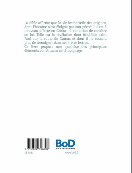 La Bible affirme que la vie immortelle des origines, dont l'homme s'est éloigné par son péché, lui est à nouveau offerte en Christ : à condition de renaître en lui. Telle est la révélation dont bénéficie saint Paul sur la route de Damas et dont il ne cessera plus de témoigner dans ses treize lettres.Ce livre propose une synthèse des principaux éléments constituant ce témoignage.