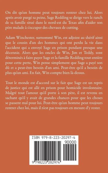 On dit qu'un homme peut toujours rentrer chez lui. Alors après avoir purgé sa peine, Sage Redding se dirige vers le ranch de sa famille situé dans le nord-est du Texas afin d'aider son père malade à s'occuper des chevaux de cutting. Adam Winchester, surnommé Win, est adjoint au shérif ainsi que le cousin d'un des hommes qui ont perdu la vie dans l'accident qui a envoyé Sage en prison pendant presque une décennie. Alors que les oncles de Win, Jim et Teddy, sont déterminés à faire payer Sage et la famille Redding tout entière pour cette perte, Win pense simplement que Sage a payé son dû et a peut-être besoin d'un ami. Peut-être qu'il a besoin de plus qu'un ami. En fait, Win compte bien là-dessus. Tout le monde est d'accord sur le fait que Sage est un repris de justice qui est allé en prison pour homicide involontaire. Malgré tout l'amour qu'il porte à son père, il est revenu en sachant qu'il y avait de grandes chances pour que les choses se passent mal pour lui. Peut-être qu'un homme peut toujours rentrer chez lui, mais il n'est pas toujours en mesure d'y rester.