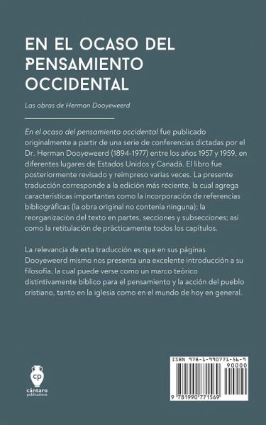 En el ocaso del pensamiento occidental fue publicado originalmente a partir de una serie de conferencias dictadas por el Dr. Herman Dooyeweerd (1894-1977) entre los años 1957 y 1959, en diferentes lugares de Estados Unidos y Canadá. El libro fue posteriormente revisado y reimpreso varias veces. La presente traducción corresponde a la edición más reciente, la cual agrega características importantes como la incorporación de referencias bibliográficas (la obra original no contenía ninguna); la reorganización del texto en partes, secciones y subsecciones; así como la retitulación de prácticamente todos los capítulos. La relevancia de esta traducción es que en sus páginas Dooyeweerd mismo nos presenta una excelente introducción a su filosofía, la cual puede verse como un marco teórico distintivamente bíblico para el pensamiento y la acción del pueblo cristiano, tanto en la iglesia como en el mundo de hoy en general. Por su corta extensión pero gran profundidad, la lectura de este texto resultará atractiva para diferentes públicos; ya que resume en buena medida el desarrollo de las ideas presentadas por Dooyeweerd en el primer volumen de su obra magna Una nueva crítica del pensamiento teórico con sus implicaciones reformadoras para las concepciones filosóficas de la ciencia, la historia, la teología y la antropología (esta última desarrollada muy ampliamente en su extensa obra Reforma y escolástica en la filosofía) desde una perspectiva radicalmente escritural.