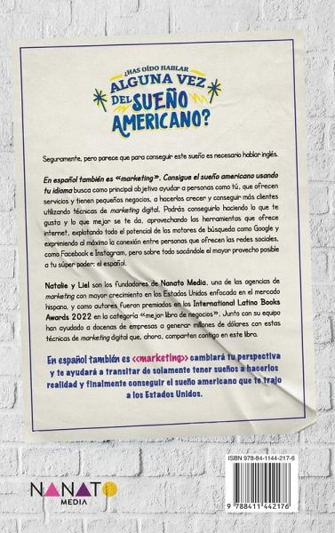 ¿Has oído hablar alguna vez del sueño americano? Seguramente, pero parece que para conseguir este sueño es necesario hablar inglés. En español también es marketing. Consigue el sueño americano usando tu idioma busca como principal objetivo ayudar a personas como tú, que ofrecen servicios y tienen pequeños negocios, a hacerlos crecer y conseguir más clientes utilizando técnicas de marketing digital. Podrás conseguirlo haciendo lo que te gusta y lo que mejor se te da, aprovechando las herramientas que ofrece internet, explotando todo el potencial de los motores de búsqueda como Google y exprimiendo al máximo la conexión entre personas que ofrecen las redes sociales, como Facebook e Instagram, pero sobre todo sacándole el mayor provecho posible a tu súper poder: el español. Natalie y Liel son los fundadores de Nanato Media, una de las agencias de marketing con mayor crecimiento en los Estados Unidos enfocada en el mercado hispano, y como autores fueron premiados en los International Latino Books Awards 2022 en la categoría mejor libro de negocios. Junto con su equipo han ayudado a docenas de empresas a generar millones de dólares con estas técnicas de marketing digital que, ahora, comparten contigo en este libro. En español también es marketing cambiará tu perspectiva y te ayudará a transitar de solamente tener sueños a hacerlos realidad y finalmente conseguir el sueño americano que te trajo a los Estados Unidos.