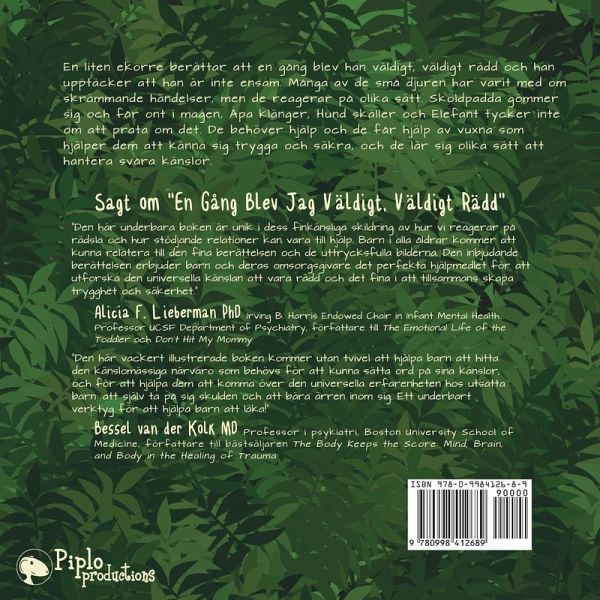 En liten ekorre berättar att en gång blev han väldigt, väldigt rädd och han upptäcker att han är inte ensam. Många av dom små djuren har varit med om skrämmande händelser, men dom reagerar på olika sätt. Sköldpadda gömmer sig och får ont i magen, Apa klänger, Hund skäller och Elefant tycker inte om att prata om det. Dom behöver hjälp och dom får hjälp av vuxna som hjälper dom att känna sig trygga och säkra, och dom lär sig olika sätt att hantera svåra känslor. Den här boken har skrivits för att hjälpa små barn som varit med om skrämmande eller traumatiska händelser.