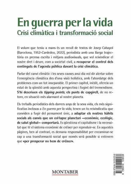El volum que teniu a mans és un recull de textos de Josep Cabayol (Barcelona, 1952-Cardedeu, 2022), periodista amb una llarga trajectòria en premsa escrita i mitjans audiovisuals, que vol reivindicar el nostre dret i deure, com a societat civil, a recuperar el control dels continguts de l'agenda pública davant la crisi climàtica. Parlar del canvi climàtic i les seves causes avui dia vol dir alertar sobre l'emergència climàtica des d'una visió holística, amb l'abordatge dels problemes com un tot inseparable. El primer capítol, inèdit, ofereix un estat de la qüestió amb aquesta perspectiva i fugint del tremendisme. S'hi descriuen els tipping points, els punts de capgirell, de no retorn, en situació més alarmant al nostre planeta. Els treballs periodístics dels darrers anys de la seva vida, els més significatius inclosos a En guerra per la vida, tenen un to reivindicatiu que conviden a fugir del pensament únic, a adaptar els nostres hàbits socials als canvis que un col·lapse planetari -econòmic, ecològic, de salut global- comportarà. Es qüestiona el capitalisme i la necessitat que té el sistema econòmic de créixer per reproduir-se. En aquestes pàgines, ben al contrari, es demana responsabilitat per encaminar-se cap a una transformació social que només serà possible si entenem que per prosperar no hem de créixer.