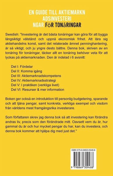 Investering är det bästa tonåringar kan göra för att bygga långsiktigt välstånd och uppnå ekonomisk frihet. Att lära sig aktiehandelns konst, samt det relaterade ämnet penninghantering, är så viktigt, och ju yngre desto bättre. Denna bok, skriven av en tonåring för tonåringar, täcker allt en tonåring behöver veta för att lyckas på aktiemarknaden. Den är indelad i 6 avsnitt: * Del I: Fördelar * Del II: Komma igång * Del III: Aktiemarknadskompetens * Del IV: Aktiemarknadsstrategi * Del V: I praktiken (verkliga livet) * Del VI: Resurser & mer information Boken ger också en introduktion till personlig budgetering, sparande och att tjäna pengar, samt konkreta, verkliga exempel och visdom från världens mest framgångsrika investerare. Som författaren skrev jag denna bok så att investering kan förändra andras liv, precis som den förändrade mitt. Oavsett vem du är, hur gammal du är och hur mycket pengar du har, kan du investera, och denna bok kommer att hjälpa dig med just det.