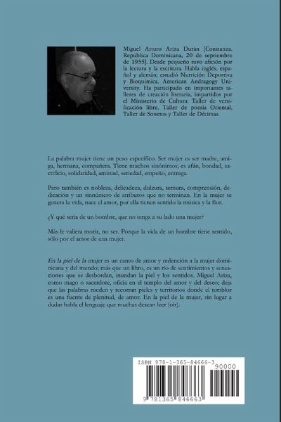 En la piel de la mujer es un canto de amor y redención a la mujer dominicana y del mundo; más que un libro es como un río de sentimientos y sensaciones que se desbordan, inundan la piel y los sentidos. Miguel Ariza, como mago o sacerdote, oficia en el templo del amor y del deseo; deja que las palabras rueden y recorran pieles y territorios donde el temblor es una fuente de plenitud, de amor. En la piel de la mujer, sin lugar a dudas habla el lenguaje que muchas desean leer (oír).