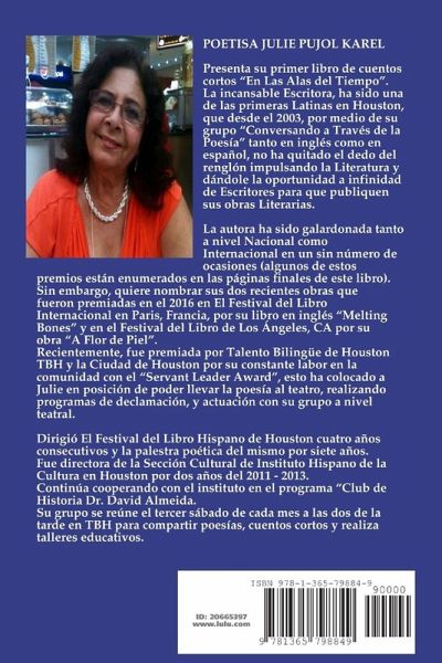 POETISA JULIE PUJOL-KAREL Presenta su primer libro de cuentos cortos "En las Alas del Tiempo". La escritora e incansable Julie Pujol Karel, ha sido una de las primeras latinas que desde el 2003 por medio del grupo que formó "Conversando a través de la poesía" tanto en inglés como en español, no ha quitado el dedo del renglón impulsando esta parte literaria y dándole una oportunidad a muchos para que sus trabajos se publiquen.