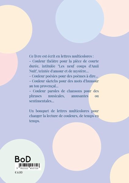 Ce livre est écrit en lettres multicolores :- Couleur théâtre pour la pièce de courte durée, intitulée "Les neuf coups d'Amii Nuit", teintée d'amour et de mystère...- Couleur poésies pour des poèmes à dire...- Couleur sketchs pour des mots d'humour au ton provençal...- Couleur paroles de chansons pour des phrases musicales, amusantes ou sentimentales...Un bouquet de lettres multicolores pour changer la lecture de couleurs, de temps en temps.Pour faire plus ample connaissance, je vous invite à la visite de mon sitehttp://andre-marras-vers-et-mots-divers.e-monsite.com