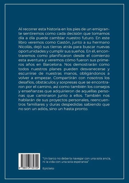Al recorrer esta historia en los pies de un emigrante sentiremos como cada decisión que tomamos día a día puede cambiar nuestro futuro. En este libro veremos como Gastón, junto a su hermano Nicolás, dejó sus tierras atrás para buscar nuevas oportunidades y cumplir sus sueños. En él, encontraremos como planificaron desde el comienzo esta aventura y veremos cómo fueron sus primeros años en Barcelona. Nos demostrarán como todos nuestros planes pueden desvanecerse y escurrirse de nuestras manos, obligándonos a volver a empezar. Compartirán con nosotros los desafíos, obstáculos y sorpresas que se encontraron por el camino, así como también los consejos y enseñanzas que adquirieron de aquellas personas que caminaron junto a ellos. También nos hablarán de sus proyectos personales, reencuentros familiares y duras despedidas sabiendo que no son un adiós, sino un hasta pronto.