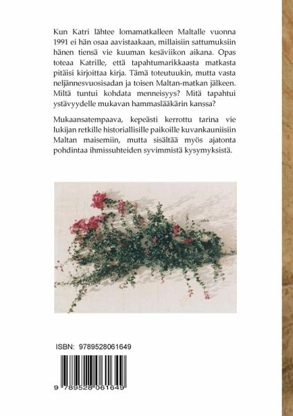 Kun Katri lähtee lomamatkalleen Maltalle vuonna 1991 ei hän osaa aavistaakaan, millaisiin sattumuksiin hänen tiensä vie kuuman kesäviikon aikana. Opas toteaa Katrille, että tapahtumarikkaasta matkasta pitäisi kirjoittaa kirja. Tämä toteutuukin, mutta vasta neljännesvuosisadan ja toisen Maltan-matkan jälkeen. Miltä tuntui kohdata menneisyys? Mitä tapahtui ystävyydelle mukavan hammaslääkärin kanssa? Mukaansatempaava, kepeästi kerrottu tarina vie lukijan retkille historiallisille paikoille kuvankauniisiin Maltan maisemiin, mutta sisältää myös ajatonta pohdintaa ihmissuhteiden syvimmistä kysymyksistä.