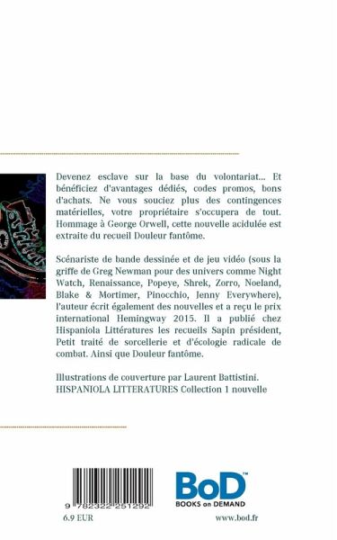 Devenez esclave sur la base du volontariat... Et bénéficiez d'avantages dédiés, codes promos, bons d'achats, bons plans. Ne vous souciez plus des contingences matérielles. Votre propriétaire s'occupera de tout. Hommage à George Orwell, cette nouvelle acidulée est extraite du recueil Sapin président (Hispaniola Littératures/BoD 2021).Illustrations de couverture par Laurent Battistini.HISPANIOLA LITTERATURES collection 1 nouvelle
