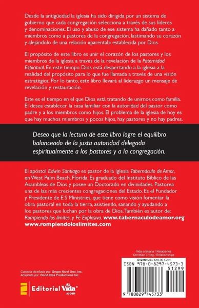 El prop¿¿sito de este libro es unir el coraz¿¿n de los pastores y los miembros de la iglesia a trav¿¿s de la revelaci¿¿n de la Paternidad espiritual. Este es el tiempo en el que Dios est¿¿ tratando de unirnos como familia. ¿¿l desea establecer la casa familiar con la autoridad del pastor como padre y los miembros como hijos. El problema de la iglesia de hoy es que hay muchos miembros y pocos hijos, hay pastores y no hay padres. Esta lectura tiene el objetivo de lograr el equilibrio balanceado de la justa autoridad delegada espiritualmente a los pastores y a la congregaci¿¿n.