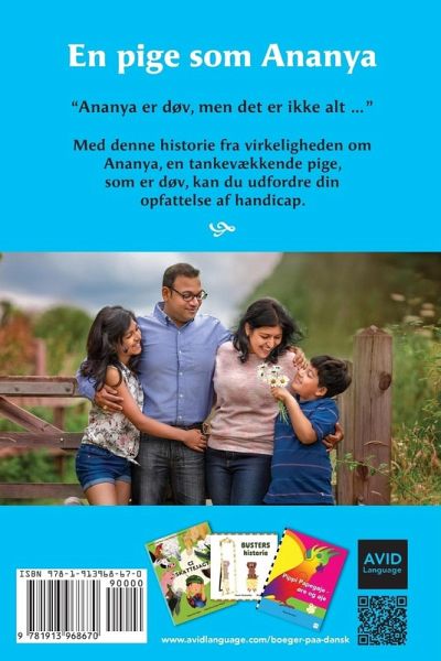 "Ananya er døv, men det er ikke alt ... " Med denne historie fra virkeligheden om Ananya, en tankevækkende pige, som er døv, kan du udfordre din opfattelse af handicap. Om forfatteren: Karen Hardwicke er mor til en ung voksen, som er døv, og har været døvelærer i mere end 10 år. Hun kan lide at læse, skrive og løbe (i godt vejr). Hun elsker at spille musik for døve børn og ryster selvkomponerede vrøvleviser ud af ærmet. -- This books is published by AVID Language, which specialises in inclusive books for children with (and without) hearing loss, available in English, Spanish, Danish, American Sign Language and British Sign Language. More information about all our books is available on the AVID Language website.