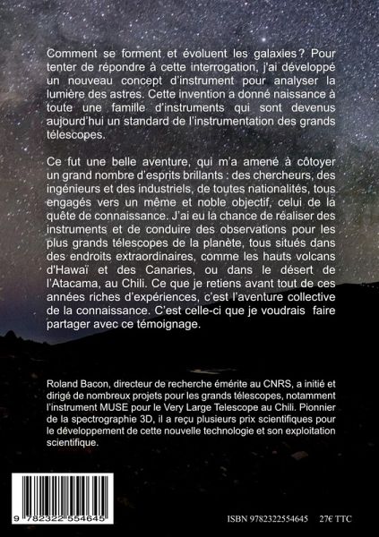 "Comment se forment et évoluent les galaxies? Pour tenter de répondre à cette interrogation, j'ai développé un nouveau concept d'instrument pour analyser la lumières des astres. Cette invention a donné naissance à toute une famille d'instruments qui sont devenus aujourd'hui un standard de l'instrumentation des grands télescopes. Ce fut une belle aventure, qui m'a amené à côtoyer un grand nombre d'esprits brillants : des chercheurs, des ingénieurs et des industriels, de toutes nationalités, tous engagés vers un même et noble objectif, celui de la quête de connaissance. J'ai eu la chance de réaliser des instruments et de conduire des observations pour les plus grands télescopes de la planète, tous situés dans des endroits extraordinaires, comme les hauts volcans d'Hawaï et des Canaries, ou dans le désert de l'Atacama, au Chili. Ce que je retiens avant tout de ces années riches d'expériences, c'est l'aventure collective de la connaissance. C'est celle-ci que je voudrais faire partager avec ce témoignage." Dans cette autobiographie scientifique, Roland Bacon retrace son parcours d'astrophysicien, marqué par l'invention, la découverte, et des rencontres marquantes. Il partage avec nous les moments clés de ses 37 années de recherches, tout en nous immergeant dans le contexte scientifique et humain où ces événements ont pris place. Ce livre se veut avant tout un témoignage vibrant de l'aventure, tant scientifique qu'humaine, qui accompagne les grands projets en astronomie. Il est magnifiquement illustré par des photographies captivantes du cosmos, des télescopes et de leur environnement.