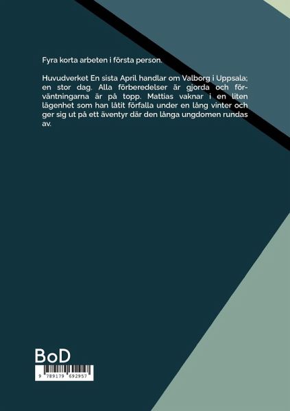 Fyra korta arbeten i första person. Huvudverket En sista April handlar om Valborg i Uppsala; en stor dag. Alla förberedelser är gjorda och förväntningarna är på topp. Mattias vaknar i en liten lägenhet som han låtit förfalla under en lång vinter och ger sig ut på ett äventyr där den långa ungdomen rundas av.