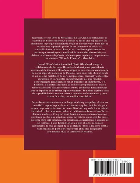 Filosofía. Ciencia. Inmortalidad. La inmortalidad individual como posible y, más aún, inevitable. Bases filosóficas y científicas. Hipótesis coherente para contestar a las eternas preguntas sobre quiénes somos, de dónde venimos y a dónde vamos. Posibilidad de intentar evitar o remediar enfermedades, y otras clases de males, por medios metafísicos.
