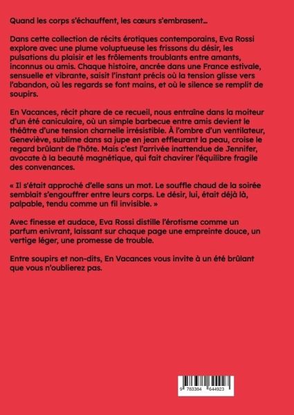 Quand les corps s'échauffent, les coeurs s'embrasent...Dans cette collection de récits érotiques contemporains, Eva Rossi explore avec une plume voluptueuse les frissons du désir, les pulsations du plaisir et les frôlements troublants entre amants, inconnus ou amis. Chaque histoire, ancrée dans une France estivale, sensuelle et vibrante, saisit l'instant précis où la tension glisse vers l'abandon, où les regards se font mains, et où le silence se remplit de soupirs.En Vacances, récit phare de ce recueil, nous entraîne dans la moiteur d'un été caniculaire, où un simple barbecue entre amis devient le théâtre d'une tension charnelle irrésistible. À l'ombre d'un ventilateur, Geneviève, sublime dans sa jupe en jean effleurant la peau, croise le regard brûlant de l'hôte. Mais c'est l'arrivée inattendue de Jennifer, avocate à la beauté magnétique, qui fait chavirer l'équilibre fragile des convenances.« Il s'était approché d'elle sans un mot. Le souffle chaud de la soirée semblait s'engouffrer entre leurs corps. Le désir, lui, était déjà là, palpable, tendu comme un fil invisible. »Avec finesse et audace, Eva Rossi distille l'érotisme comme un parfum enivrant, laissant sur chaque page une empreinte douce, un vertige léger, une promesse de trouble.Entre soupirs et non-dits, En Vacances vous invite à un été brûlant que vous n'oublierez pas.