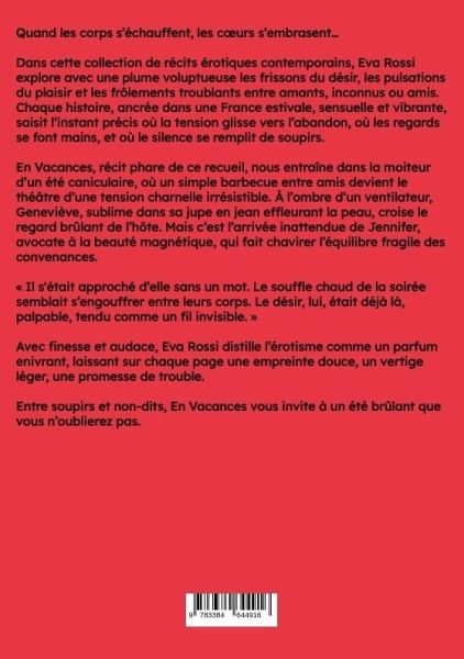 Quand les corps s'échauffent, les coeurs s'embrasent...Dans cette collection de récits érotiques contemporains, Eva Rossi explore avec une plume voluptueuse les frissons du désir, les pulsations du plaisir et les frôlements troublants entre amants, inconnus ou amis. Chaque histoire, ancrée dans une France estivale, sensuelle et vibrante, saisit l'instant précis où la tension glisse vers l'abandon, où les regards se font mains, et où le silence se remplit de soupirs.En Vacances, récit phare de ce recueil, nous entraîne dans la moiteur d'un été caniculaire, où un simple barbecue entre amis devient le théâtre d'une tension charnelle irrésistible. À l'ombre d'un ventilateur, Geneviève, sublime dans sa jupe en jean effleurant la peau, croise le regard brûlant de l'hôte. Mais c'est l'arrivée inattendue de Jennifer, avocate à la beauté magnétique, qui fait chavirer l'équilibre fragile des convenances.« Il s'était approché d'elle sans un mot. Le souffle chaud de la soirée semblait s'engouffrer entre leurs corps. Le désir, lui, était déjà là, palpable, tendu comme un fil invisible. »Avec finesse et audace, Eva Rossi distille l'érotisme comme un parfum enivrant, laissant sur chaque page une empreinte douce, un vertige léger, une promesse de trouble.Entre soupirs et non-dits, En Vacances vous invite à un été brûlant que vous n'oublierez pas.