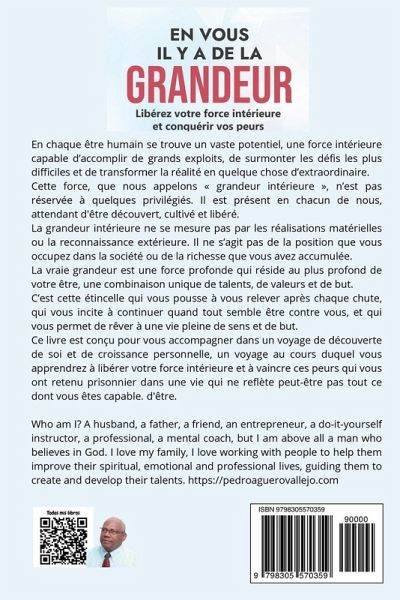 En chaque être humain se trouve un vaste potentiel, une force intérieure capable d'accomplir de grands exploits, de surmonter les défis les plus difficiles et de transformer la réalité en quelque chose d'extraordinaire. Cette force, que nous appelons grandeur intérieure, n'est pas réservée à quelques privilégiés. Il est présent en chacun de nous, attendant d'être découvert, cultivé et li-béré. La grandeur intérieure ne se mesure pas par les réalisa-tions matérielles ou la reconnaissance extérieure. Il ne s'agit pas de la position que vous occupez dans la société ou de la richesse que vous avez accumulée. La vraie grandeur est une force profonde qui réside au plus profond de votre être, une combinaison unique de talents, de valeurs et de but. C'est cette étincelle qui vous pousse à vous relever après chaque chute, qui vous incite à continuer quand tout semble être contre vous, et qui vous permet de rêver à une vie pleine de sens et de but. Ce livre est conçu pour vous accompagner dans un voyage de découverte de soi et de croissance personnelle, un voya-ge au cours duquel vous apprendrez à libérer votre force intérieure et à vaincre ces peurs qui vous ont retenu pri-sonnier dans une vie qui ne reflète peut-être pas tout ce dont vous êtes capable. d'être. Ici, nous explorerons comment identifier et activer votre potentiel caché, comment surmonter les barrières men-tales qui limitent votre grandeur et comment vivre avec courage et détermination pour réaliser vos rêves les plus ambitieux. En progressant dans les pages de ce livre, vous découvrirez que la grandeur n'est pas une destination, mais un che-min. C'est un processus continu de croissance, d'appren-tissage et de transformation. Peu importe où vous en êtes dans votre vie en ce moment; Ce qui compte, c'est que vous soyez prêt à vous lancer dans ce voyage de libération personnelle. Tout ce dont vous avez besoin pour être génial existe déjà en vous. Il vous suffit de le détacher. Je vous fournis les outils, les stratégies et les réflexions nécessaires pour que vous puissiez découvrir et embrasser cette grandeur intérieure. Ensemble, nous affronterons vos peurs, surmonterons vos limites et libérerons le pou-voir qui réside déjà en vous. Car lorsque vous osez libérer votre force intérieure, aucu-ne peur ne peut vous arrêter, aucun rêve ne reste hors de votre portée. C'est le moment de briller, d'être la meilleure version de vous-même et de vivre une vie vraiment belle. Bienvenue à la première étape vers votre transformation personnelle. Il y a de la grandeur en vous, et c'est le mo-ment de la découvrir.