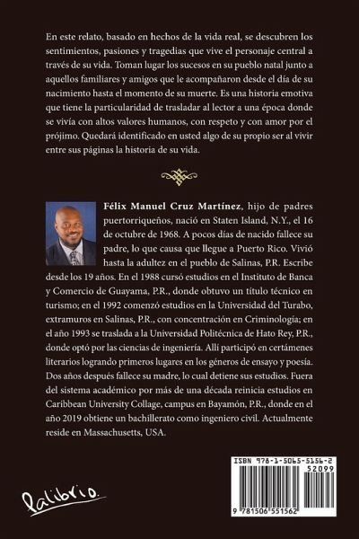 En este relato, basado en hechos de la vida real, se descubren los sentimientos, pasiones y tragedias que vive el personaje central a través de su vida. Toman lugar los sucesos en su pueblo natal junto a aquellos familiares y amigos que le acompañaron desde el día de su nacimiento hasta el momento de su muerte. Es una historia emotiva que tiene la particularidad de remontar al lector a una época donde se vivía con altos valores humanos, con respeto y con amor por el prójimo. Quedará identificado en usted algo de su propio ser al vivir entre sus páginas la historia de su vida.