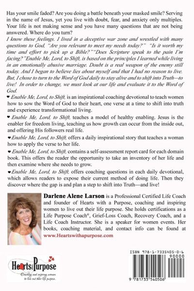 What happens when we get stuck in life? How can we change when we have lived with abuse, anxiety, doubt, lies, manipulation, and fear? How do we discover purpose? In the 31 day devotional, Enable me, Lord, to Shift, (book 1) Darlene A. Larson, Life Purpose Coach teaches and coaches in a tested, tried, and trustworthy way, God's Word works.