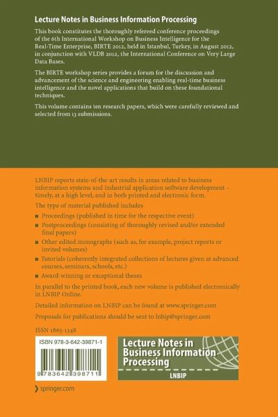 6th International Workshop, BIRTE 2012, Held at the 38th International Conference on Very Large Databases, VLDB 2012, Istanbul, Turkey, August 27, 2012, Revised Selected Papers Herausgegeben:Castellanos, Malu; Dayal, Umeshwar; Rundensteiner, Elke A.