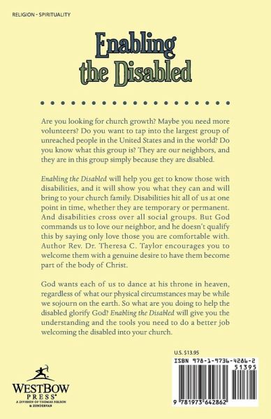 Are you looking for church growth? Maybe you need more volunteers? Do you want to tap into the largest group of unreached people in the United States and in the world? Do you know what this group is? They are our neighbors, and they are in this group simply because they are disabled. Enabling the Disabled will help you get to know those with disabilities, and it will show you what they can and will bring to your church family. Disabilities hit all of us at one point in time, whether they are temporary or permanent. And disabilities cross over all social groups. But God commands us to love our neighbor, and he doesn't qualify this by saying only love those you are comfortable with. Author Rev. Dr. Theresa C. Taylor encourages you to welcome them with a genuine desire to have them become part of the body of Christ. God wants each of us to dance at his throne in heaven, regardless of what our physical circumstances may be while we sojourn on the earth. So what are you doing to help the disabled glorify God? Enabling the Disabled will give you the understanding and the tools you need to do a better job welcoming the disabled into your church.