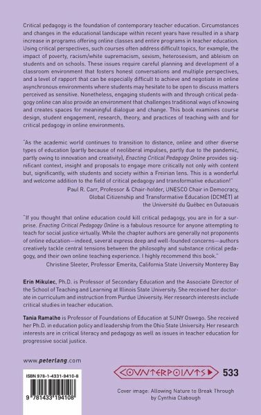 "As the academic world continues to transition to distance, online and other diverse types of education (partly because of neoliberal impulses, partly due to the pandemic, partly owing to innovation and creativity), Enacting Critical Pedagogy Online provides significant context, insight and proposals to engage more critically not only with content but, significantly, with students and society within a Freirian lens. This is a wonderful and welcome addition to the field of critical pedagogy and transformative education!" Paul R. Carr, Professor & Chair-holder, UNESCO Chair in Democracy, Global Citizenship and Transformative Education (DCMÉT) at the Université du Québec en Outaouais