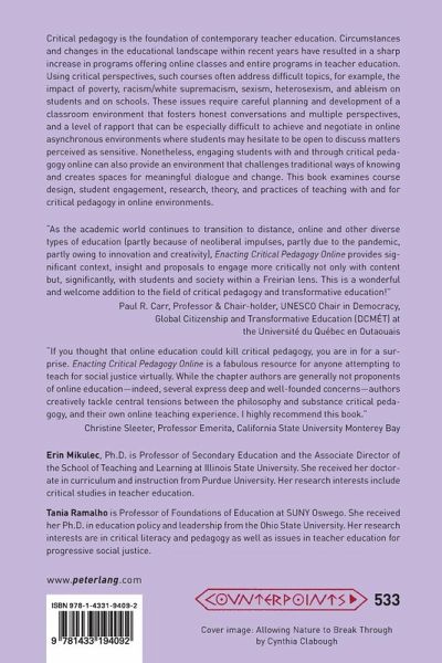 "As the academic world continues to transition to distance, online and other diverse types of education (partly because of neoliberal impulses, partly due to the pandemic, partly owing to innovation and creativity), Enacting Critical Pedagogy Online provides significant context, insight and proposals to engage more critically not only with content but, significantly, with students and society within a Freirian lens. This is a wonderful and welcome addition to the field of critical pedagogy and transformative education!" Paul R. Carr, Professor & Chair-holder, UNESCO Chair in Democracy, Global Citizenship and Transformative Education (DCMÉT) at the Université du Québec en Outaouais