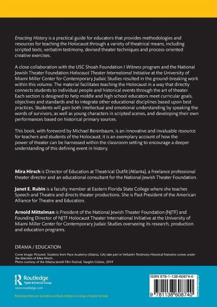 Enacting History is a practical guide for educators that provides methodologies and resources for teaching the Holocaust through a variety of theatrical means, including scripted texts, verbatim testimony, devised theater techniques and process-oriented creative exercises.