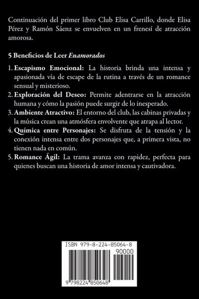 Continuación del primer libro Club Elisa Carrillo, donde Elisa Pérez y Ramón Sáenz se envuelven en un frenesí de atracción amorosa. 5 Beneficios de Leer EnamoradosEscapismo Emocional: La historia brinda una intensa y apasionada vía de escape de la rutina a través de un romance sensual y misterioso. Exploración del Deseo: Permite adentrarse en la atracción humana y cómo la pasión puede surgir de lo inesperado. Ambiente Atractivo: El entorno del club, las cabinas privadas y la música crean una atmósfera envolvente que atrapa al lector. Química entre Personajes: Se disfruta de la tensión y la conexión intensa entre dos personajes que, a primera vista, no tienen nada en común. Romance Ágil: La trama avanza con rapidez, perfecta para quienes buscan una historia de amor intensa y cautivadora.