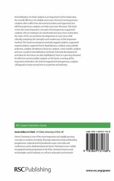 Immobilization of chiral catalysts is an important tool for improving the overall efficiency of catalytic processes. However, heterogeneous catalysts often suffer from decreased activities and supported, but still homogeneous catalysts can help overcome this issue. This book covers the most important concepts of homogeneous supported catalysis with an emphasis on enantioselective processes. It describes the state-of-the-art and latest developments in each area while critically evaluating the strengths and weaknesses of this important method. The book encompasses ionically-tagged catalysts, supported organocatalysts, supported ionic liquid phases, catalysis using soluble polymers, catalytic dendrimers, fluorous catalysts, water soluble catalysts and non-covalent immobilization methods. Potential developments and ideas for the future are also highlighted. There is a growing demand for effective and recyclable catalysts so this book, covering all the important methods in the field of supported homogeneous catalysis, will appeal to many researchers in academia and industry.
