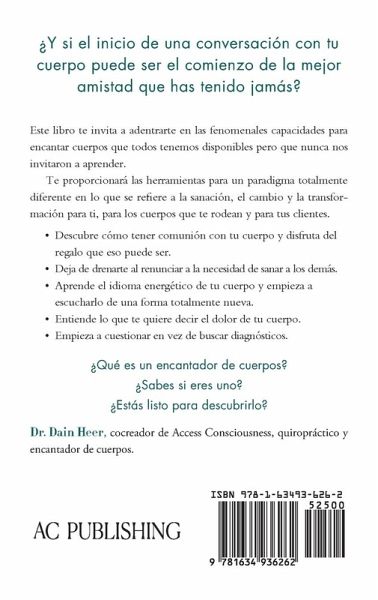 ¿Y si el inicio de una conversación con tu cuerpo puede ser el comienzo de la mejor amistad que has tenido jamás? Este libro te invita a adentrarte en las fenomenales capacidades para encantar cuerpos que todos tenemos disponibles pero que nunca nos invitaron a aprender. Te proporcionará las herramientas para un paradigma totalmente diferente en lo que se refiere a la sanación, el cambio y la transformación para ti, para los cuerpos que te rodean y para tus clientes. · Descubre cómo tener comunión con tu cuerpo y disfruta del regalo que eso puede ser. · Deja de drenarte al renunciar a la necesidad de sanar a los demás. · Aprende el idioma energético de tu cuerpo y empieza a escucharlo de una forma totalmente nueva. · Entiende lo que te quiere decir el dolor de tu cuerpo. · Empieza a cuestionar en vez de buscar diagnósticos. ¿Qué es un encantador de cuerpos? ¿Sabes si eres uno? ¿Estás listo para descubrirlo? Dr. Dain Heer, cocreador de Access Consciousness, quiropráctico y encantador de cuerpos.