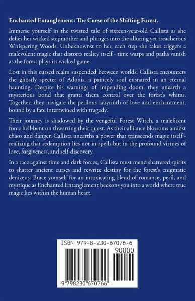 Enchanted Entanglement: The Curse of the Shifting Forest. Immerse yourself in the twisted tale of sixteen-year-old Callista as she defies her wicked stepmother and plunges into the alluring yet treacherous Whispering Woods. Unbeknownst to her, each step she takes triggers a malevolent magic that distorts reality itself - time warps and paths vanish as the forest plays its wicked game. Lost in this cursed realm suspended between worlds, Callista encounters the ghostly specter of Adonis, a princely soul ensnared in an eternal haunting. Despite his warnings of impending doom, they unearth a mysterious bond that grants them control over the forest's whims. Together, they navigate the perilous labyrinth of love and enchantment, bound by a fate intertwined with tragedy. Their journey is shadowed by the vengeful Forest Witch, a maleficent force hell-bent on thwarting their quest. As their alliance blossoms amidst chaos and danger, Callista unearths a power that transcends magic itself - realizing that redemption lies not in spells but in the profound virtues of love, forgiveness, and self-discovery. In a race against time and dark forces, Callista must mend shattered spirits to shatter ancient curses and rewrite destiny for the forest's enigmatic denizens. Brace yourself for an intoxicating blend of romance, peril, and mystique as Enchanted Entanglement beckons you into a world where true magic lies within the human heart.
