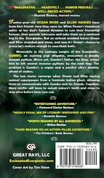 Twelve-year-old OCEAN RIVER is a goofy kid. He's never met a problem he couldn't solve with a joke or a silly dance. When his best friend, ELLEN HANSEN, loses her father, life suddenly gets a lot more serious, and Ocean's immature antics at the funeral threaten to ruin their friendship forever. Just a few miles away, in the swampy jungle of the Everglades, another young boy named GUMBO struggles with his born destiny. This boy just happens to be an alligator, the heir to the great gator kingdom. Not only is Gumbo reluctant to be a leader, but his father, the king, has ordered him to kill several pythons by the next day. The problem is Gumbo’s a pacifist. And a vegan. And, oh, deathly afraid of snakes. Gumbo and his best friends, BIX, a naïve, cheerful soft-shelled turtle, and their guru, ASHA, a wise old wood stork who's teaching Gumbo yoga, reluctantly set off on their mission. Meanwhile, the humans are on a mission of their own: a family vacation to the Everglades, Ellen’s belated birthday gift, holds the hope of saving Ocean and Ellen's friendship. When a tour boat crash leaves the kids lost and alone in the gator-infested swamp, they receive animal superpowers from a legendary Seminole Indian ghost. Now they can talk to animals, including Gumbo, and it seems like getting lost together was just what they needed. Except, of course, for the giant mutant python who has serious plans for dinner . . . and revenge. In this funny and heartwarming fantasy set in the fragile ecosystems of the Everglades, Ocean and Ellen and their new animal friends learn how to let go of the past and trust each other in the present, where forgiveness and empathy—even for killer pythons—might just save the day.