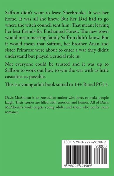 Saffron didn't want to leave Sherbrooke. It was her home. It was all she knew. But her Dad had to go where the witch council sent him. That meant leaving her best friends for Enchanted Forest. The new town would mean meeting family Saffron didn't know. But it would mean that Saffron, her brother Anan and sister Primrose were about to enter a war they didn't understand but played a crucial role in. Not everyone could be trusted and it was up to Saffron to work out how to win the war with as little casualties as possible. This is a young adult book suited to 13+ Rated PG13.