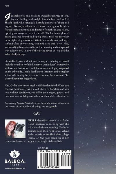 Geila takes you on a wild and incredible journey of love, joy, and healing, and straight into the heart and soul of Shaula Pearl, who survived a horrific existence of abuse and neglect. To truly enchant her, it took the magic of belief, a fearless enchantment plan, and support from the angelic realms, opening doorways to the spirit world. The luminous glow of divine guidance poured in, helping Shaula Pearl rise above her most frightening memories. Within a year, she was no longer stiff and afraid of everything, crammed into a small closet. Also, she found joy. It manifested in such an amazing and unexpected way, it leaves you in awe of the divine power of love and the value of all journeys. Shaula Pearl glows with spiritual messages, reminding us that all souls deserve their joyful inheritance, that it doesn't matter who we love, but that we love, and that animals are highly respected on the other side. Shaula Pearl knows that now, embracing her self-worth, linking her to the sacredness of her own soul. She claimed her inner-dog goddess. Also, Geila's own innate psychic abilities flourished. When you connect passionately with a soul who feels hopeless, and you love without conditions, you call in your angels, guides, and even your deceased dogs, with their own brand of enchantment. Enchanting Shaula Pearl takes you beyond a rescue story, into the realms of spirit, where all things are imaginable.