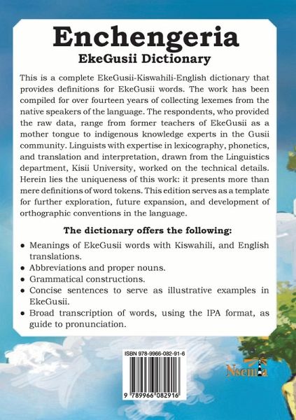 Enchengeria The EkeGusii Dictionary This is a complete EkeGusii-Kiswahili-English dictionary that provides definitions for EkeGusii words. The work has been compiled for over fourteen years of collecting lexemes from the native speakers of the language. These respondents who provided the raw data range from former teachers of EkeGusii as a mother tongue to indigenous knowledge experts in the Gusii community. Linguists with expertise in lexicography, phonetics, and translation and interpretation drawn from the Linguistics department, Kisii University, worked on the technical details. Herein lies the uniqueness of this work: it presents more than mere definitions of word tokens. This edition serves as a template for further exploration, future expansion, and development of orthographic conventions in the language.The dictionary has the following: ¿ Meanings of EkeGusii words with KiSwahili, and English translations¿ Abbreviations and proper nouns¿ Concise sentences serving as illustrative examples in EkeGusii.¿ Broad transcription of words using IPA to serve as a guide to pronunciation ¿ Coverage of grammatical constructions