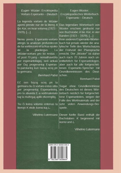 La kvina parto (ä „liverpartoj") de la fama Enciklopedia vortaro Esperanta-germana de Eugen Wüster (EV) entenas la kapvortojn de la resto de la litero k kaj de la litero l. La unua kvar partoj (A ¿is korno), eldonita de la Esperanto-fako de la germana eldonejo Ferdinand Hirt & Sohn, Lepsiko en la 1920-aj jaroj, estas däre haveblaj en la libroservoj; la sesa parto (literoj M, N kaj O) estas eldonita de MAS en 2015, 130 päoj (ISBN 978/2-36960-032-9). Per tiu ¿i libro la EV estas nun libroforme disponebla de la literoj A ¿is O. La sepa parto konsistos el la kapvortoj de la litero P kaj tekstoj de Bernardo Pabsto pri la EV.