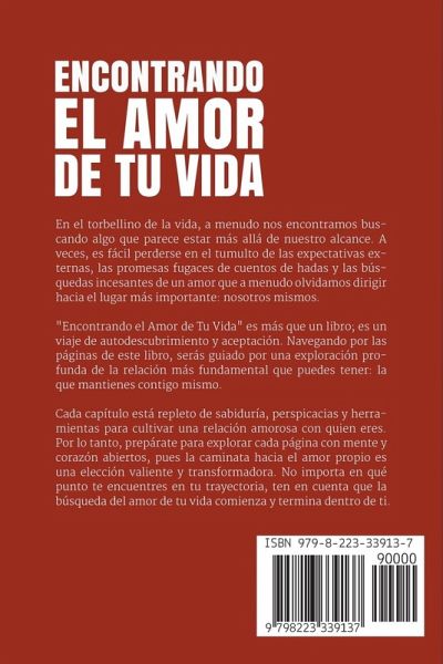 En el torbellino de la vida, a menudo nos encontramos buscando algo que parece estar más allá de nuestro alcance. A veces, es fácil perderse en el tumulto de las expectativas externas, las promesas fugaces de cuentos de hadas y las búsquedas incesantes de un amor que a menudo olvidamos dirigir hacia el lugar más importante: nosotros mismos. "Encontrando el Amor de Tu Vida" es más que un libro; es un viaje de autodescubrimiento y aceptación. Navegando por las páginas de este libro, serás guiado por una exploración profunda de la relación más fundamental que puedes tener: la que mantienes contigo mismo. Cada capítulo está repleto de sabiduría, perspicacias y herramientas para cultivar una relación amorosa con quien eres. Por lo tanto, prepárate para explorar cada página con mente y corazón abiertos, pues la caminata hacia el amor propio es una elección valiente y transformadora. No importa en qué punto te encuentres en tu trayectoria, ten en cuenta que la búsqueda del amor de tu vida comienza y termina dentro de ti.