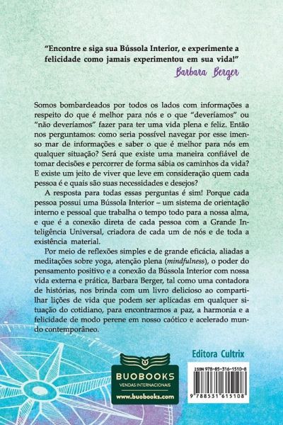 "Vivemos numa época em que somos bombardeados por todos os lados com informações a respeito do que é melhor para nós. Então nos perguntamos: como seria possível navegar por esse imenso mar de informações e tomar decisões confiáveis? Por meio de reflexões simples e de grande eficácia, aliadas a meditações sobre yoga, atenção plena, o poder do pensamento positivo e a conexão da Bússola Interior com nossa vida externa - um sistema de orientação interno e pessoal que trabalha o tempo todo para a nossa alma -, Barbara Berger nos brinda com um livro delicioso ao compartilhar lições de vida que podem ser aplicadas em qualquer situação do cotidiano, para encontrarmos a paz, a harmonia e a felicidade de modo perene em nosso caótico e acelerado mundo contemporâneo."