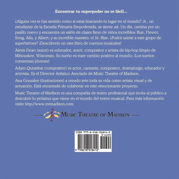 Finding your superpower isn't easy... Have you ever felt like you were trying to find your place in the world? Jr., a student at Empowering Elementary, feels that way. One day, he ventures down a new hallway and comes upon a classroom full of amazing kids: Rue, Flower, Song, Alia, and Albert, and their awesome teacher, Mr. Rise. Will he be able to join their team of superheroes? Find out in this musical storybook! Alexis Dean (Author) is an educator, author, composer, and clean hip-hop artist originally from Milwaukee, Wisconsin. His dream is to positively change the world; Dreams Start Young! Adam Qutaishat (Composer) is an actor, singer, composer, playwright, educator, and activist. He is Music Theatre of Madison's Associate Artistic Director. Ana Gonzalez (Illustrations) has been creating art her whole life as a visual artist and performer. She is over the moon to be collaborating on this exciting project! Music Theatre of Madison is a professional theatre company that challenges audiences to discover what's next in the world of musical theatre. Learn more at http://www.mtmadison.com