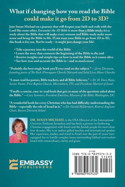 What if changing how you read the Bible could make it go from 2D to 3D? Many people want to read and study the Bible but don't know where to start, or when they do read it, they don't connect how the events, people, and places fit together and quickly lose interest. And some don't wholeheartedly believe what the Bible says. Yet International Christian Embassy Jerusalem USA Director Susan Michael says the Bible is the most exciting book on the planet-and understanding the story behind the stories changes everything. In these pages you will: Take a journey into the world of the Bible Learn the story that connects the beginning of the Bible to the end Receive insight and tips on how to read the Bible so it comes alive Understand how true and accurate the Bible is And more Join Susan on a journey that will deepen your faith and walk with the Lord like none other. Encounter the 3D Bible is more than a Bible study; it's a study about the Bible that will bring a more profound understanding to every sermon you hear and Bible study you participate in. If you want your Bible to go from 2D to 3D, this book is for you. But be ready-it might just change your life! Foreword by bestselling author and Bible teacher Kay Arthur.