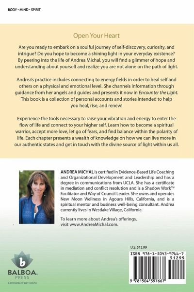 Are you ready to open your heart and soul to the journey of self-discovery, curiosity, and intrigue? Do you hope to become a shining light in your everyday existence? By peering into the life of Andrea Michal, you will find a glimmer of hope and understanding about yourself and realize you are not alone on the path of light. Andrea's practice includes connecting to energy fields in order to heal self and others on a physical and emotional level. She channels information through guidance from her angels and guides and presents it now in Encounter the Light. This book is a collection of personal accounts and stories intended to help you heal, rise, and renew! Experience the tools necessary to raise your vibration of light and energy to enter the flow of life and connect to your higher self. Learn how to become a spiritual warrior, accept more love, let go of fears, and find balance within the polarity of life. Each chapter presents a wealth of knowledge on how we can live more in our authentic states as unique individuals. Get in touch with the divine source inside of you.