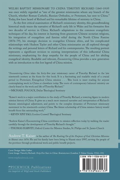 Welsh Baptist missionary to China Timothy Richard (1845-1919) was once widely regarded as ""one of the greatest missionaries whom any branch of the Church, whether Roman Catholic, Russian Orthodox, or Protestant, has sent to China."" Today, few have heard of Richard and his remarkable lifetime of ministry in China. As the first critical examination of Richard's missionary identity, this groundbreaking historical study traces the narrative of Richard's early life in Wales and his formative first two decades of service in China. Richard's adaptations to the common evangelistic techniques of his day, his interest in learning from grassroots Chinese sectarian religions, his integration of evangelism and famine relief during the North China Famine (1876-79), his strategic decision to evangelize Chinese elites, and his complicated relationships with Hudson Taylor and other China missionaries are all explored through the writings and personal letters of Richard and his contemporaries. The resulting portrait represents a significant revision to existing interpretations of this influential China missionary, emphasizing his deep empathy for the people of China and his abiding evangelical identity. Readable and relevant, Encountering China provides a new generation with an introduction to this lost legend of China mission.