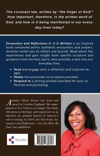 The covenant law, written by "the finger of God!" How important, therefore, is the written word of God, and how is it being manifested in our everyday lives today? Encounters and Reflections II: It Is Written is an inspired book conceived within authentic encounters and prayers. Annette invites you to reflect and journal. Read about her experiences and gain insight from specific scripture and guidance from the Holy Spirit, who provides a lens into our everyday lives. Read and engage with a reflection and inspired images. Relate the encounter to scripture provided. Respond to a writing prompt provided for your reflection and journaling.