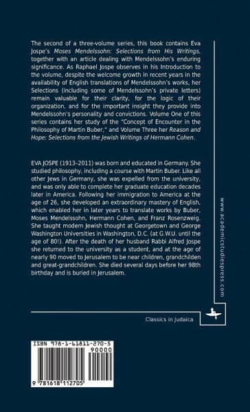The second of a three-volume series, this book contains Eva Jospe's Moses Mendelssohn: Selections from His Writings, together with an article dealing with Mendelssohn's enduring significance. As Raphael Jospe observes in his introduction to the volume, despite the welcome growth in recent years in the availability of English translations of Mendelssohn's works, Eva Jospe's Selections (including some of Mendelssohn's private letters) remain valuable for their clarity, for the logic of their organization, and for the important insight they provide into Mendelssohn's personality and convictions. Volume One of this series contains Eva Jospe's study of the "Concept of Encounter in the Philosophy of Martin Buber," and Volume Three her Reason and Hope: Selections from the Jewish Writings of Hermann Cohen. Together, these volumes offer a multidimensional view of Jospe's work and thoughts.
