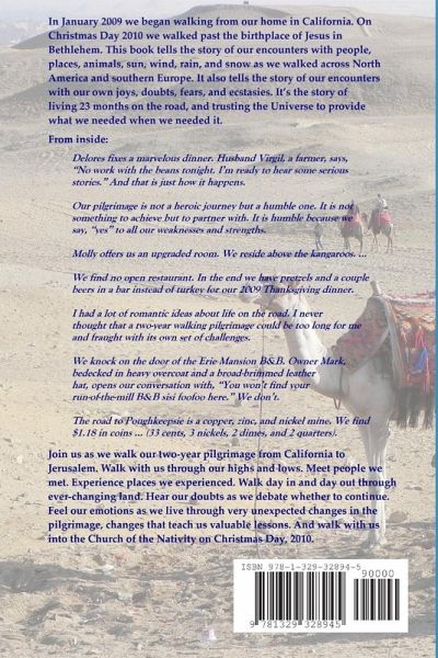 This is the second edition of the story of our epic walk across America and Europe to Jerusalem. In January 2009, we began walking east from our home on the central California coast on my 66th birthday. On Christmas Day 2010, we walked past the birthplace of Jesus in Bethlehem. Our pilgrimage was over. This book tells the story of our encounters with people, places, animals, sun, wind, rain, snow, roads, and paths and their effects on our bodies, minds, and souls as we walked across North America and southern Europe. It also tells the story of our encounters with our own joys, doubts, fears, and ecstasies. It is the story of living 23 months on the road, of trusting the Universe to provide what we needed when we needed it.